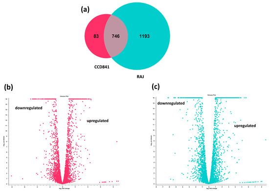 Differential transcriptome profiles of E. coli O157:H7 in CCD CoN 841 and RAJ cells (total transcriptomic data without filtration). (a) Venn diagram showing unique and differentially expressed genes. Volcano plots showing differentially expressed E. coli O157:H7 genes in CCD CoN 841 cells (b) and RAJ cells (c). In volcano plots, the relationship between p-values and the magnitude of the difference in expression values was noted. X-axis indicates log2 fold change threshold, and Y-axis depicts −log10 (p-values).