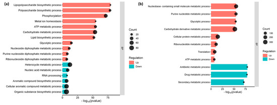 Enriched functional categories of differentially expressed genes. (a) E. coli O157:H7 attached to CCD CoN 841 cells. (b) E. coli O157:H7 attached to RAJ cells. The x-axis is on log10 (p-value) scale. BP denotes ‘biological process.’.