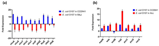 Expression patterns of differentially expressed genes. (a) Upregulated virulence genes in E. coli O157:H7 adhered to CCD CoN 841. (b) Highly expressed virulence genes in E. coli O157:H7 during RAJ adhesion. Virulence genes were identified in a search with the virulence factor database (VFDB) (http://www.mgc.ac.cn/VFs/main.htm, accessed on 14 July 2023). Gene expression data represent the mean of three replicates ± standard deviation. Please note that some house-keeping genes were also included in the VFDB.