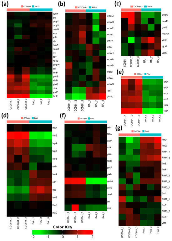 Heat maps of transcriptional responses of E. coli O157:H7 during the initial adherence of human CCD CoN 841 cells and bovine RAJ cells based on functional analysis. (a) Outer membrane proteins. (b) Lipopolysaccharide metabolic processes. (c) Polysaccharide biosynthesis. (d) Cellular homeostasis. (e) Antibiotic metabolic processes and secondary metabolism. (f) Glycolytic pathway. (g) Cell adhesion or fimbriae/pilus assembly and regulation. Transformed FPKM (Fragments Per Kilobase of Transcript per Million) numbers (normalized read counts) are represented by colors, with green indicating lower expression and red indicating higher expression.