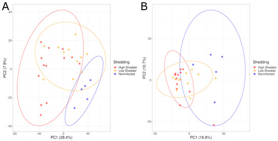 PCA graphs comparing the serum metabolome composition of low shedders, high shedders and noninfected animals in negative acquisition mode (A) 1 DPI and (B) 21 DPI.