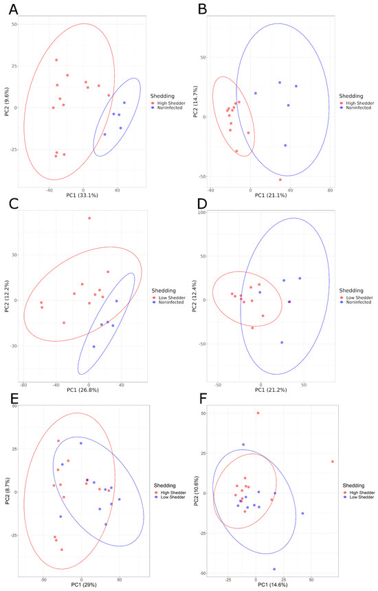 PCA graphs of pairwise comparisons of the serum metabolome composition of low shedders, high shedders and noninfected animals in negative acquisition mode (A,C,E) 1 DPI and (B,D,F) 21 DPI.