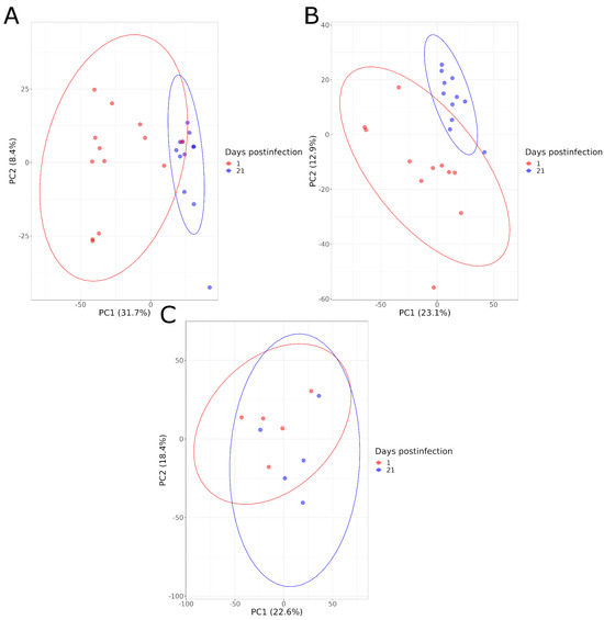 PCA graphs comparing the serum metabolome composition of animals at 1 and 21 DPI in negative acquisition mode for high shedders (A), low shedders (B) and noninfected animals (C).