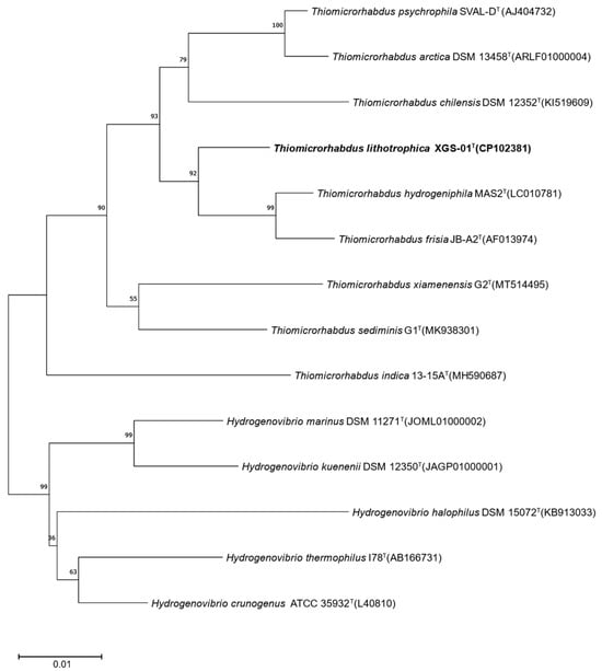 The genome size of strain XGS-01T was 2.5 Mb, and the G+C content of strain XGS-01T was 39.1 mol%, which is similar to those of T. hydrogeniphila MAS2T (39.6 mol%) [] and T. frisia. JB-A2T (39.6 mol%) [] and lower than that of T. chilensis DSM 12352T (49.9 mol%) []. The average nucleotide identity (ANI) values between strain XGS-01T and other species were below the thresholds for species delineation (95–96%) [], indicating that strain XGS-01T represents a novel species of the genus Thiomicrorhabdus. None of them have plasmids.