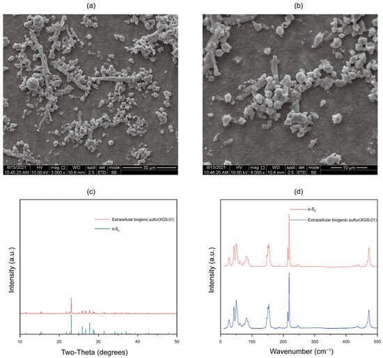 The morphology and structure of extracellular sulfur. (a,b) Extracellular sulfur morphology under scanning electron microscopy; (c) XRD pattern of extracellular sulfur; (d) Raman spectroscopy of extracellular sulfur.