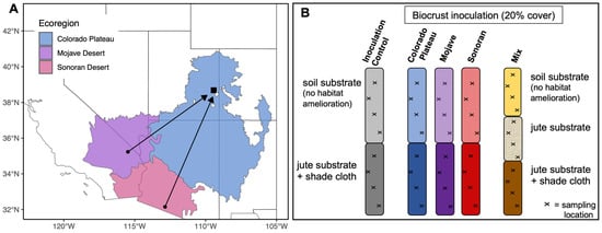 (A) Map of biocrust collection sites. Square point represents both the Colorado Plateau collection locations and the cultivation facility. Black arrows represent the movement of hot desert biocrusts to the Colorado Plateau. The blue, purple, and pink polygons represent the footprints of the Colorado Plateau, Mojave, and Sonoran Deserts, respectively. Modified from Young et al. (2016) [] (with permission). (B) Experimental set-up at the cultivation facility, with columns corresponding to different types of biocrust inoculum (e.g., Colorado Plateau, Mojave, Sonoran) and sections of each column corresponding to habitat amelioration treatments (e.g., soil or jute substrate). Note that the intermediate jute substrate treatment was only evaluated with mixed inoculum.