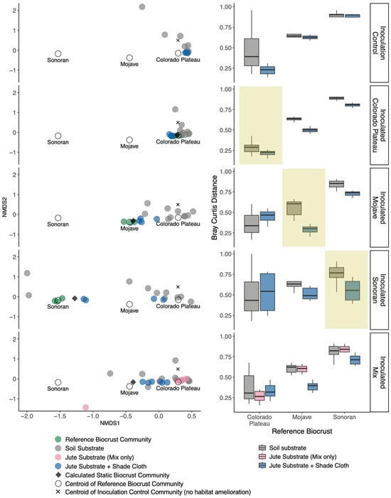 Non-metric Multidimensional Scaling (NMDS) on Bray–Curtis dissimilarities of cyanobacterial relative abundance for inoculation controls and the inoculated cultivated biocrusts (left panels). Black diamonds represent the calculated static cyanobacterial community composition (see methods for description). The green points represent the intact cyanobacterial communities at each desert, with the open circles showing the centroid (average) of the intact cyanobacterial community for comparison. The black Xs represent the centroid (average) for inoculation control soils. A single ordination was calculated (stress = 0.129), which is separated into panels for each desert for visual interpretation. Boxplots (right panels) indicate the pairwise Bray–Curtis distances from each cultivated inoculum sample to the three reference cyanobacterial communities from the Colorado Plateau, Mojave, and Sonoran deserts. Smaller distance values indicate that the cyanobacterial communities are more similar in ordination space. Yellow highlighted boxes indicate where we would expect more similarity (lower Bray–Curtis distance) in cyanobacterial composition based on the community that was initially inoculated.