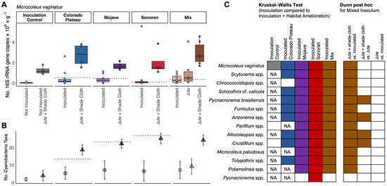 (A) Comparison of the absolute abundance of Microcoleus vaginatus in each inoculum, including the inoculation control soils, each desert separately, and the mix, with and without habitat amelioration (jute substrate + shade cloth). The boxes represent the lower and upper quartiles, and the solid horizontal line represents the median value. The points represent each replicate. Horizontal dotted lines represent the mean absolute abundance calculated for a static community. (B) Average cyanobacteria richness (±standard deviation) for the cultivation controls and the cultivated communities for each treatment at the genus/species level. The horizontal dotted lines indicate the richness of the reference biocrusts from each desert; error bars represent standard deviation. (C) Statistical summary of the response of the dominant 14 cyanobacterial genera or species (ordered most to least abundant, top to bottom) to cultivation with versus without habitat amelioration. The colored boxes indicate significant increases in absolute abundance (p > 0.05) with habitat amelioration as compared to inoculation only; the white boxes indicate no difference in abundance with habitat amelioration. NA represents cases where the soils being compared had no reads from that taxon. The right set of boxes indicate the pairwise comparisons (Dunn post hoc) of the three habitat amelioration treatments for the mixed inoculum.