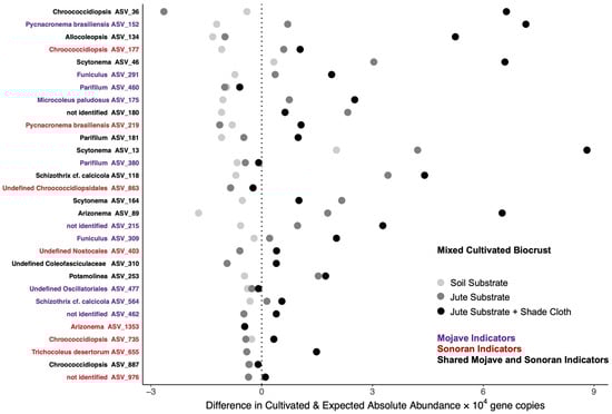 As a way of tracking the abundance of cyanobacterial ASVs unique to each hot desert source, we used indicator taxa analysis, which considers both the presence of ASVs across samples from a particular desert and their uniqueness to that desert. We identified many significant cyanobacterial indicators for both the Mojave and Sonoran deserts, including members of the Coleofasciculaceae family [] (Figure 5). In a mixed-inoculum cultivation without habitat amelioration, most hot-desert indicator taxa had lower abundance than expected based on the calculated static community. Some ASVs responded well to habitat amelioration, with higher abundance than expected when provided with either a jute substrate or a jute substrate and a shade cloth. Two Scytonema ASVs (13 and 46) initially found in both the Mojave and Sonoran deserts but not in the Colorado Plateau biocrusts had higher abundance than expected for all three treatments. Other ASVs responded positively to cultivation with habitat amelioration, including Chroococcidiopsis spp., Pycnacronema brasiliensis, Allocoleopsis spp., and Arizonema spp.