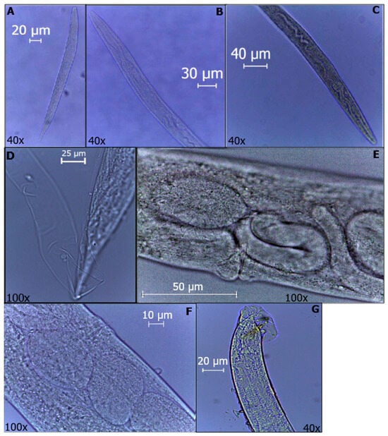 Developmental stages of O. myriophila. (A) J1. (B) J2. (C) J3. (D) J4. (E) Endotokia matricida of female. (F) Female with eggs inside. (G) Male rays and spicules are visible.