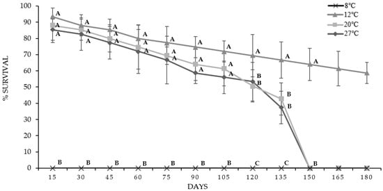 No significant differences were observed in terms of survival, but at up to 120 days of analysis, survival decreased to 66.67% at 12 °C, 42.67% at 20 °C and 37.33% at 27 °C.