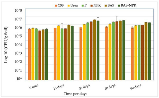 Changes in hydrocarbon degrader counts (CFU g−1 soil) in contaminated soil samples with treatments. Bars represent the average of triplicate plate counts; error bars indicate the standard deviation of the triplicates. Abbreviations: CSS, control soil sample; P, phosphorus; NPK, nitrogen, phosphorous, and potassium; BAS: bio-augmentation soil.