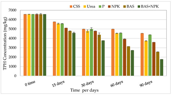 Reduction in TPHs in contaminated soil samples with treatments. Bars represent the average of triplicate microcosms readings; error bars indicate the standard deviation of the triplicates. Abbreviations: Abbreviations: CSS, control soil sample; P, phosphorus; NPK, nitrogen, phosphorous, and potassium; BAS: bio-augmentation soil.