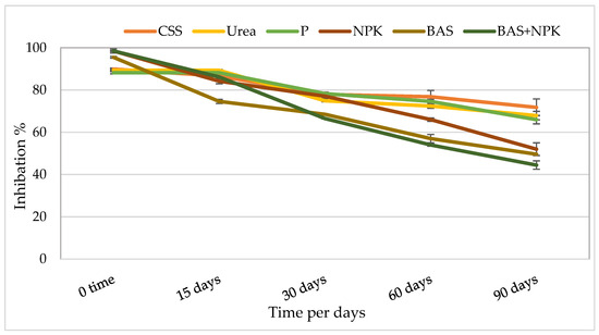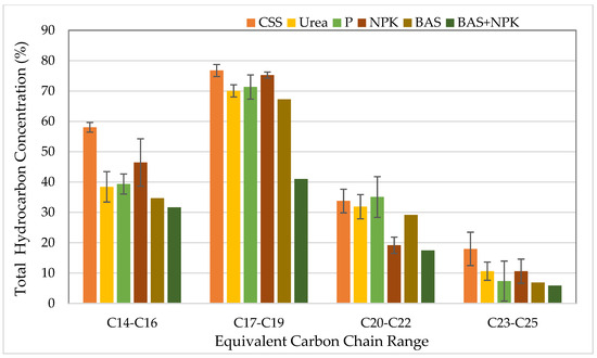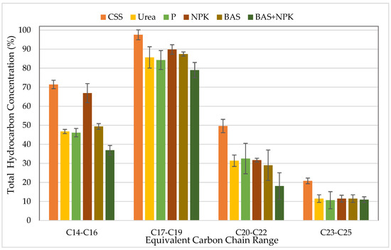 Representative GC chromatograms of TPHs extracted from petroleum-contaminated soil after 90 days of incubation shown as percentages remaining compared to those at the initiation of the experiment (zero time). Bars represent the means of triplicate samples. Error bars indicate the standard deviation of the triplicates. Abbreviations: CSS, control soil sample; P, phosphorus; NPK, nitrogen, phosphorous, and potassium; BAS: bio-augmentation soil.