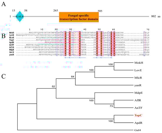 Within this cluster, our investigation unveiled the presence of a putative activator gene named topC. This gene encodes a fungal cluster-specific C6 transcriptional factor. (Figure 1), which likely plays a role in regulating the expression of cluster genes. The full length of the TopC protein contains 802 amino acids and has a molecular weight of approximately 87.76 kDa. Bioinformatics analysis indicated that TopC is a typical multidrug-resistant transcription factor in fungi. It possesses an N-terminal CAL4-type Zn2Cys6 DNA-binding domain and a C-terminal fungal transcription factor regulatory middle homology domain (Figure 1 and Figure S3).