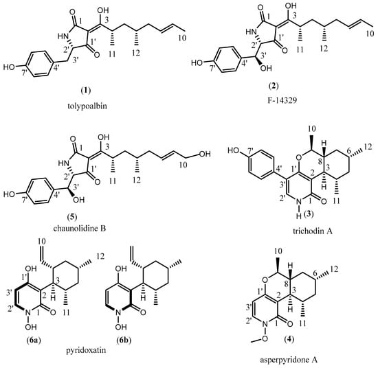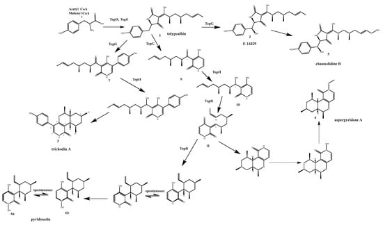 In summary, we propose a biosynthetic pathway for pyridoxatin, trichodin A, and asperpyridone A in T. ophioglossoides, as depicted in Figure 7, building upon previous biosynthesis studies [,].