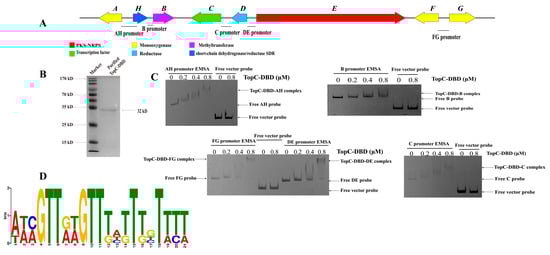 Heterologous expression of TopC and analysis of its affinity binding to promoter DNA via EMSA. (A) we designed the promoters within the top gene cluster. (B) The expression of TopC-DBD with a His-tag in E. coli was achieved successfully, as depicted by the rightward arrow, yielding purified topC-DBD protein with a molecular weight of 32 kD. (C) Affinity binding analysis of TopC to five gene promoters within top via EMSA. (D) the conserved binding motif of TopC was predicted via MEME analysis.