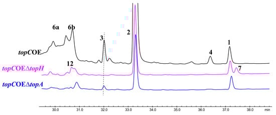 HPLC profiles of the culture broth of topCOE, topCOEΔtopA, and topCOEΔtopH (λ = 280 nm).