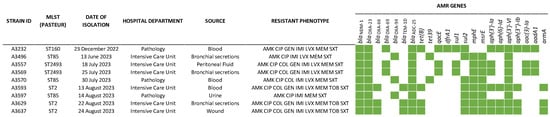 The identification and the susceptibility testing of the isolates were performed by the automated Vitek-2 system (BioMerieux, Marcy l’ Etoile, France). The Minimal Inhibitory Concentration (MICs) of imipenem and meropenem were confirmed by MIC test strips (Liofilchem, Roseto degli Abruzzi, Italy); the MIC to colistin was determined by the broth microdilution method (ComASP™ Colistin, Liofilchem, Roseto degli Abruzzi, Italy), according to the EUCAST guidelines (www.eucast.org) []. All isolates found to be phenotypically resistant to imipenem (MIC > 4 mg/L) and meropenem (MIC > 8 mg/L) were tested for the presence of carbapenemase-encoding genes: blaOXA-23, blaOXA-58, blaKPC, blaVIM, and blaNDM by employing a relevant PCR followed by sequencing analysis [,].