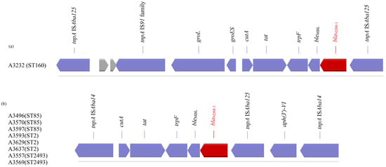 The first structure was found only in one strain which belonged to ST160 and was identical to that previously described by Poirel et al. []. The blaNDM-1 gene is embedded in transposon Tn125, a 10,099-bp composite transposon bracketed by two copies of the insertion sequence (IS) ISAba125 orientated in the same direction. In a search within the NCBI data, we found that the above structure is located either on the chromosome of a microorganism (AP014649, LN868200, LN997846, CP053215, CP027528, CP091596, CP130627, CP130628, CP050388, CP050403, CP072398, CP072295, CP072300, CP072290, CP072275, CP072285, CP072280, CP072270, CP072122, AND CP087312) or on plasmids (JN377410.2, CP0488828.1, CP059301, CP047975, CP098796, and CP129246).