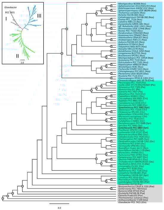 Maximum likelihood phylogenetic inference of cyanobacteria BvdR protein sequences. Evolutionary analysis was conducted in RAxML v 8.2.11 using the GAMMA model of rate heterogeneity and BLOSUM62 substitution matrix. The most likely tree inferred from 100 bootstrap replicates is shown with bootstrap values >50% identified as grey filled circles at the corresponding nodes. The basal cyanobacterium Gloeobacter violaceus PCC 7421 was used to root the tree. Taxa are labeled by genus and strain when available, otherwise by genus and species, followed by abbreviated taxonomic order in parentheses. Taxonomic orders include: Gloeobacterales (Glo), Thermostichales (The), Pseudanabaenales (Pse), Oscillatoriales (Osc), Synechococcales (Syn), Desertifilales (Des), Spirulinales (Spi), Chroococcales (Chr), Pleurocapsales (Ple), Chroococcidiopsidales (Chrd), and Nostocales (Nos). Three major clades were identified based on the unrooted phylogram (top left inset): I (grey—Gloeobacter PCC 7421 through Neosynechococcus CAUP A 1101); II (lime—Stenomitos ULC18 through Pleurocapsa PCC 7319); and III (blue—Chroococcidiopsis SAG 39.79 through Mastigocoleus BC008). See Table S1 for detailed information and metrics of all accessions used. The Synechocystis 6803 and Synechococcus 7002 sequences labels are in bold for easier viewing.