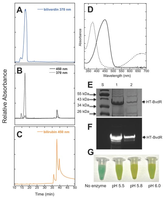 The BvdR from Synechococcus 7002 was not very soluble when produced at 30 °C in E. coli, and the protein had to be produced at 18 °C in order to purify enough protein to perform the assays. When we co-expressed this protein with heme oxygenase from Synechocystis 6803 (in the hope that the presence of Bvd would result in a more soluble enzyme), we had a higher yield of the enzyme (Figure 2E); however, the Bvd present in these cells did not form stable complexes with BvdR because, after elution from the Co-affinity column, there was no Bvd bound as judged using absorption spectroscopy. When the proteins separated by SDS-PAGE were probed with antibodies made against the recombinant BvdR of Synechocystis 6803, one major protein band was recognized, corresponding to the predicted size of the HT-BvdR at 36.9 kDa (Figure 2F). The optimal pH of the Synechococcus 7002 BvdR enzyme was 5.8, the same as reported for the Synechocystis 6803 BvdR enzyme [] as determined by viewing the yellow color of 1 mL assays after 30 min when the final pH of the assays was varied from pH 5.5 to 6.0 (Figure 2G). Together, these results demonstrate that Synechococcus 7002 BvdR can reduce Bvd to bilirubin using NADPH as the coenzyme.