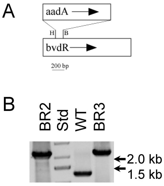 Creation of a bvdR mutant. Two segments of the bvdR gene (SYNPCC7002_A2324) were amplified by a polymerase chain reaction (PCR) using Synechococcus 7002 chromosomal DNA as template and Taq DNA polymerase. A 557-bp fragment including a portion upstream of the bvdR gene was amplified using 7002bvdR.up.F (5′ CGGTGCCTGAAATCAGTTTCCC 3′) and 7002BvdR.up.R (5′ ACGTGTTTCCCCGCTTCGAG 3′). This PCR product was digested with HincII (restriction site present within the Synechococcus 7002 bvdR gene) and was purified by electrophoresis on an agarose gel. A 702-bp fragment containing the 3′ portion of the Synechococcus 7002 bvdR gene was amplified using 7002bvdR.Dn.F (5′ TCGAAGCGGGGAAACACGTAG 3′) and 7002bvdR.Dn.R (5′ AAAAGCTTAGGTTTGGCC CAGGGCAGCCCG 3′) primers; this product was digested with BamHI (restriction site present within bvdR gene) and was purified using agarose gel electrophoresis. Plasmid pSRA81 containing the aadA gene, which confers resistance to spectinomycin, was digested with HincII and BamHI; the 1050-bp DNA fragment encoding aadA was also purified using agarose gel electrophoresis. The 557-bp bvdR upstream HincII fragment, the 1050 bp aadA HincII-BamHI fragment, and the 702-bp bvdR downstream BamHI-digested fragment were mixed and ligated together. This ligation mixture was then transformed into WT Synechococcus 7002 cells as described previously [,]. Transformants were selected on plates containing medium A+ supplemented with spectinomycin (50 µg/mL) and glycerol (10 mM) and solidified with 0.8% (w/v) Bacto-agar (Difco, ThermoFisher Scientific, Waltham, MA). Colonies were serially streaked on plates containing spectinomycin and then grown with and without glycerol in liquid medium. The full segregation of the WT and mutant alleles of bvdR was verified by PCR amplification using primers 7002bvdR.up.F and 7002bvdR.Dn.R. Template DNA from the WT strain produced a 1245-bp amplicon, while template DNA from the bvdR mutant produced a 2265-bp product.