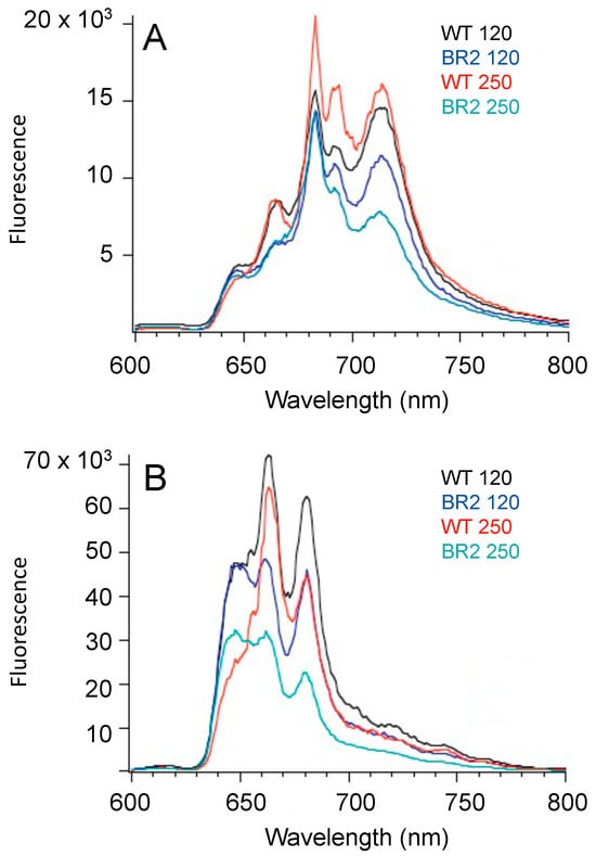 The differences in the PBP and Chl levels within cells can also be revealed and compared using fluorescence emission spectroscopy at a low temperature (77 K). Fluorescence emission spectra at 77 K were measured with the preferential excitation of Chl a at 440 nm for intact cells of the WT and the BR2 mutant grown to the same cell density at normal light intensity (250 μE m−2 s−1) or at medium light intensity (120 μE m−2 s−1) (Figure 4A). For the WT cells, the 715 nm emission occurs from Chls associated with PSI complexes, the 695 nm emission from Chls associated with CP47 (PsbB) of PS II, and the 685 nm emission from Chls associated with CP43 (PsbC) of PSII []. Consistent with the lower pigment content of the cells of the BR2 mutant, the overall fluorescence emission from the Chl proteins (PSI and PSII) was lower in amplitude than for the WT cells. The emission from PSI in the BR2 mutant was specifically lower in cells grown at normal light intensity.