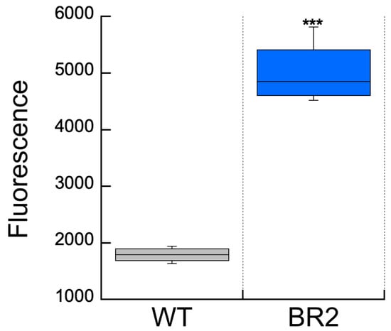 Measurement of ROS within WT and BR2 mutant cells. Cells were loaded with the fluorescein dye derivative CM-H2DCFDA, incubated in high light (2240 μE m−2 s−1), and the relative average fluorescence measured as described in the Materials and Methods. Box and whisker plots with error bars indicate the standard deviation for the three measurements for each cell type (WT cells (dark grey) and BR2 mutant cells (blue). The mean for each data set is indicated by the horizontal line. Asterisks indicate statistical significance levels of ROS for the BR2 mutant compared to WT using a two-tailed t-test, assuming unequal variance performed using MS excel: *** p < 0.001.