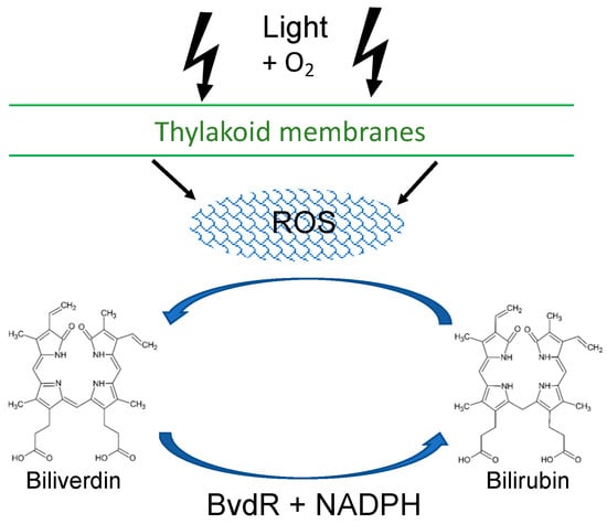 Plants contain heme oxygenase, and its product, Bvd, is the substrate for the HY2 enzyme that produces phytochromobilin [], the chromophore bound to the plant photoreceptor phytochrome []. However, plants do not contain a gene for BvdR [,,]. Very recently, Ishikawa et al. demonstrated that bilirubin is formed non-enzymatically in chloroplasts of multiple plant species when Bvd reacts with NADPH []. This group detected bilirubin using the bilirubin-dependent fluorescent eel protein UnaG [] while imaging live plant cells []. Bilirubin was detected in the angiosperms Nicotiana benthamiana and Arabidopsis thaliana as well as in the early diverging plant, the liverwort Marchantia polymorpha, suggesting this pigment is likely present in all plants []. Bilirubin had been detected in plants previous to this study []. Importantly, Ishikawa et al. showed that the ectopic expression of rat BvdR in plant chloroplasts increased bilirubin levels, while decreasing ROS levels []. The amount of bilirubin produced in plants non-enzymatically is estimated to be much less than the amount produced by BvdR in mammals. Ishikawa et al. postulate that this level of bilirubin is sufficient and important for plants to contribute to scavenging ROS because plants do not have as much free heme that needs to be degraded as mammals do (due to the degradation of hemoglobin) []. Plants also have a much higher level of NADPH produced in chloroplasts as a result of photosynthetic electron transport, allowing it to react with Bvd to produce bilirubin.