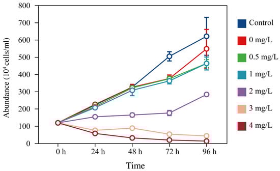The culture abundance (104 cells/mL, mean ± SD) of Chaetoceros curvisetus in the control group (pure seawater) and six surfactin treatments (0, 0.5, 1, 2, 3, and 4 mg/L surfactin) throughout a 96-h cultivation period. Data are expressed as means ± standard error (error bars).