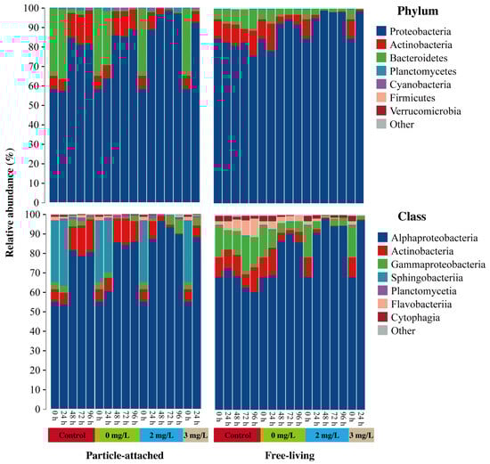 Relative abundance of particle-attached and free-living bacterioplankton samples at the phylum and class levels. Control group (pure seawater) and two surfactin treatments (0 and 2 mg/L surfactin) were analyzed throughout a 96-h cultivation period, while 3 mg/L of the surfactin treatment was analyzed throughout a 24-h cultivation period.