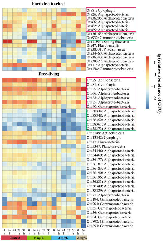 Heatmap of the relative abundance of sensitive operational taxonomic units (OTUs) at the class levels in the particle-attached and free-living bacterioplankton samples after lg transformation. Abundant OTUs are marked in the red boxes, while rare OTUs are marked in the green boxes.