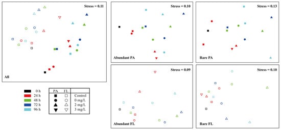 Nonmetric multidimensional scaling (NMDS) plots based on the Bray–Curtis dissimilarity of bacterioplankton community composition. All represents the whole bacterioplankton community including both particle-attached (PA) and free-living (FL) bacterioplankton. Abundant indicates abundant taxa, while rare indicates rare taxa. Different colors represent different cultivation periods (0 h, 24 h, 48 h, 72 h, 96 h). Different shapes represent control group (pure seawater) and three surfactin treatments (0, 2 and 3 mg/L surfactin), while solid shapes indicate PA bacterioplankton, and hollow shapes indicate FL bacterioplankton.