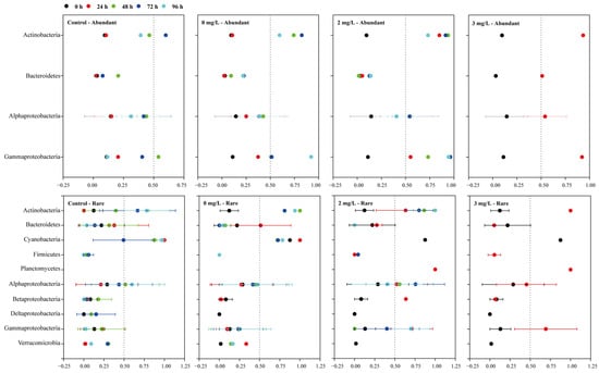 Particle-association niche (PAN) index of the abundant and rare bacterial taxa at the phylum/class level in the control group (pure seawater) and three surfactin treatments (0, 2 and 3 mg/L surfactin). The vertical dashed line corresponds to a 0.5 PAN index, which indicates that the relative abundance of free-living bacterioplankton is equal to that of particle-attached bacterioplankton. Error bars indicate standard errors of the PAN index of operational taxonomic units (OTUs) belonging to each phylum/class. Data are expressed as means ± standard error (error bars).