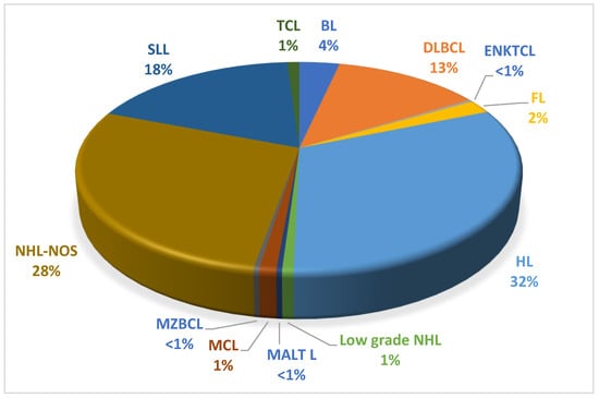 Histologic subtypes of lymphoma in all study participants (n = 288). Abbreviations: DLBCL: diffuse large B cell lymphoma; BL: Burkitt lymphoma; HL: Hodgkin’s lymphoma; NHL: non-Hodgkin’s lymphoma—not otherwise specified; SLL: small lymphocytic lymphoma; FL: follicular lymphoma, MCL: mantle cell lymphoma; MALT L: mucosa-associated lymphoid tissue lymphoma; MZBCL: marginal zone B cell lymphoma; ENKTCL: extranodal natural killer/T cell lymphoma; TCL: T cell lymphoma.