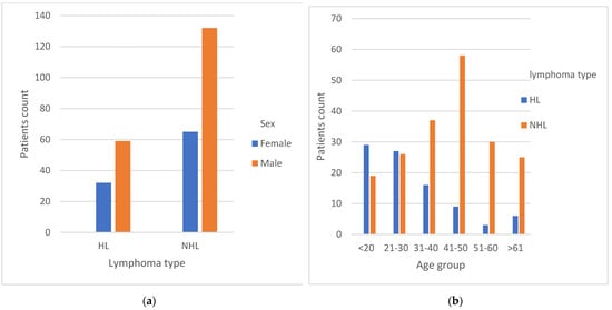 Distribution of sex and age groups with the lymphoma types. (a) The distribution of different lymphoma types with sex; (b) the distribution of different lymphoma types with age group. Abbreviations: HL: Hodgkin’s lymphoma; NHL: non-Hodgkin’s lymphoma.