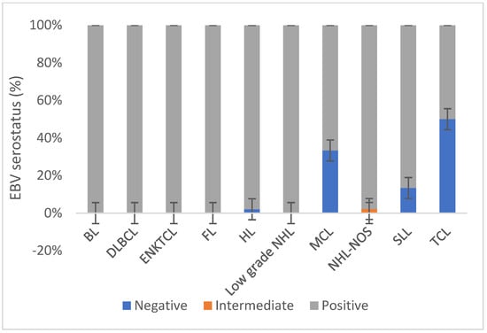 Serological detection of the EBV among different lymphoma types in Ethiopia. Abbreviations: DLBCL: diffuse large B cell lymphoma; BL: Burkitt lymphoma; HL: Hodgkin’s lymphoma; NHL-NOS: non-Hodgkin’s lymphoma—not otherwise classified; SLL: small lymphocytic lymphoma; FL: follicular lymphoma, MCL: mantle cell lymphoma, ENKTCL: extranodal natural killer/T cell lymphoma; TCL: T cell lymphoma; Low grade NHL: Low grade non-Hodgkin’s lymphoma.