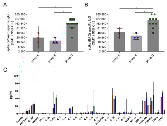 Immune response in patients with COVID-19. Spike-specific IgG titers, assessed against the Wuhan (wild type) (A) and BA.2 (B) proteins, evaluated via ELISA of plasma samples collected 30 days from the last SARS-CoV-2 negative swab in the three different groups of patients. Data are expressed as titers, calculated as the reciprocal of the lowest sample dilution yielding a 2-fold increase in the optical density (OD) value compared to the background. (C) Cytokine response assessed via Luminex immunoassay in plasma samples collected 7 days after symptoms resolution. Data are expressed as concentration (pg/mL). Red columns represent group A, blue columns represent group B, and green columns represent group C. Mann–Whitney U tests were used to assess the statistical differences between different groups. * p < 0.05.
