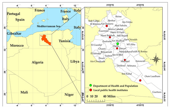 Geographical location of Djelfa province showing its communes and public health institutions.