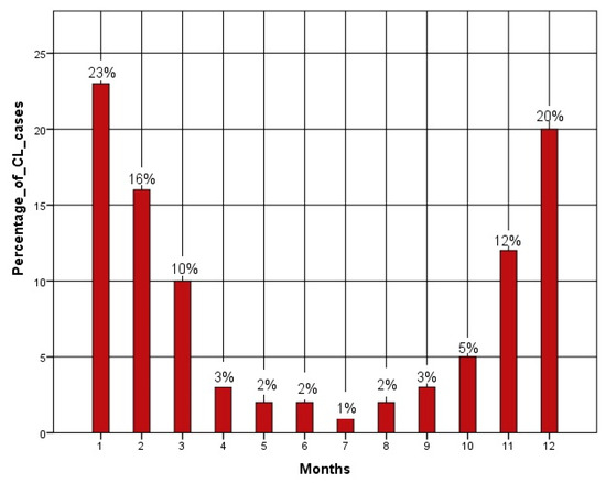 Regarding seasonal variations in all periods of the study, the percentage of cases of CL was very high during the winter period, with 23% in January and 16% in February, then it decreased to a minimum during the summer period, from 1% in July to a gradual rise over the months until it reached 12% of cases in November and 20% in December (Figure 2).