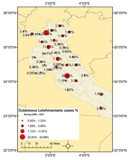 Spatial distribution of CL cases by commune in Djelfa province. Communes with weak or strong incidence are represented by circles, and CL cases are indicated by percentages (%).
