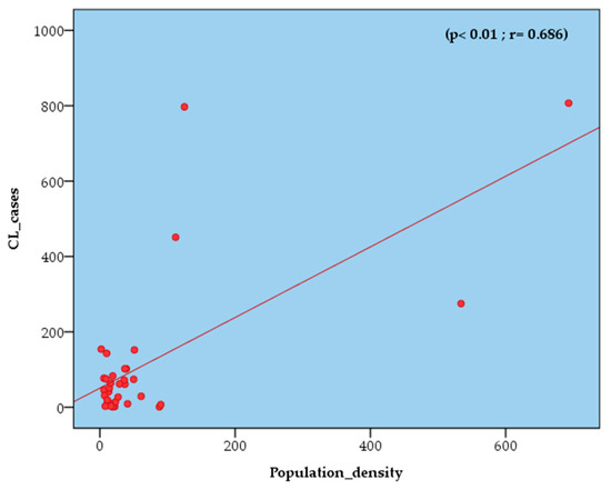 Figure 4. Pearson correlation: between annual CL incidences from 2006 to 2021 vs. population density. - -