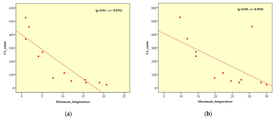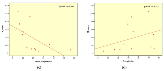 Figure 5. Pearson correlation: between CL incidences from 2009 to 2021 vs. climate factors—(a) minimum temperature; (b) maximum temperature; (c) mean temperature and (d) precipitation. The correlation is significant at the 0.01 level and at the 0.05 level .