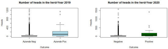 Figure 1 shows the box plots of the variable number of animals on the farms, divided into positive and negative farms: as can be seen from the graphs, the positive farms are those with a greater number of animals.