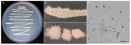 Colony and microscopic characteristics of BV01. (A–C) General colonies on nutrient agar; (D) Gram-stained cells. Bar: D = 10 µm.