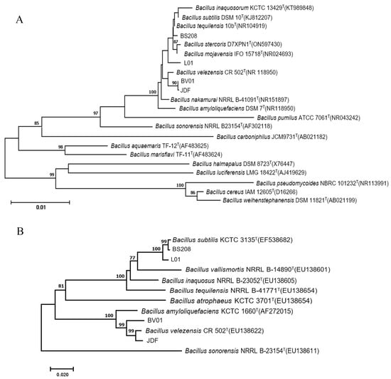 Phylogenetic trees generated based on sequences of 16S rRNA (A) and gyrA (B) regions of Bacillus species. NJBP values greater than 75% are shown at the nodes.