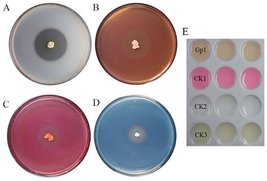 Detection of extracellular enzyme production and growth-promotion traits of BV01. (A) protease; (B) cellulase; (C) β-1,3-glucanase; (D) siderophore; (E) indole-3-acetic acid (IAA); Gp1: BV01 suspension, CK1: 10 mg/mL IAA, CK2: sterilize distilled water, CK3: NB.