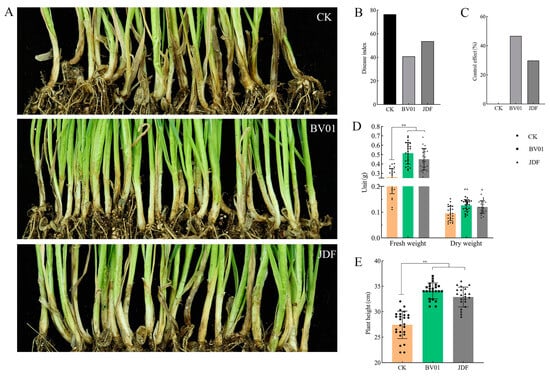 Lesions at the stem bases of wheat were obviously brown in the non-treated control, while those treated with BV01 and JDF were very slightly infected (Figure 5A). The disease indices of CK, BV01, and JDF were 76.4, 40.8, and 53.6, respectively (Figure 5B). In the BV01 treatment, infection with wheat root rot was significantly (p < 0.05) reduced, the relative control efficacy was 47% (Figure 5C), and the fresh and dry weights (Figure 5D) and plant height (Figure 5E) were increased by 91%, 34%, and 24%, respectively.