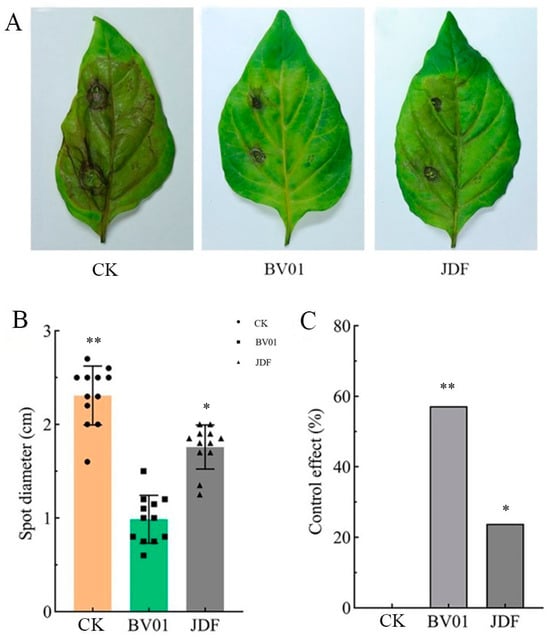 The symptoms on pepper leaves of the control were severe, on those treated with JDF were moderate, and on those treated with BV01 were weak (Figure 6A). The average diameter of a spot was 2.31, 0.99, and 1.76 cm in the CK, BV01, and JDF treatments (Figure 6B). The control effect reached 57% and 24% for the treatments with BV01 and JDF, respectively (Figure 6C).